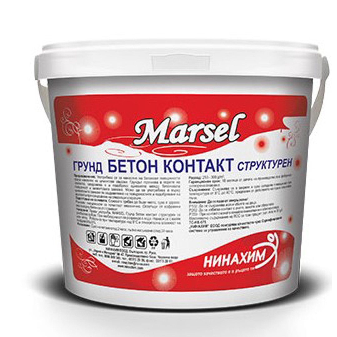 Marsel грунд бетон контакт структурен. Производител Нинахим. Употребява се за нанасяне на бетонови повърхности преди нанасяне на циментови замазки. Грундът прониква в порите на основата, заздравява я и подобрява адхезията между бетоновата повърхност и циментовата замазка. Може да се употребява и върху циментовите замазки за заздравяване на повърхностите и подобряване на адхезията при извършване на следващи операции. Разбърква се добре и при необходимост се разрежда с вода. Нанася се с валяк или четка. Разход 250-300 гр/м2 за един слой. Разфасовка 5 кг.
