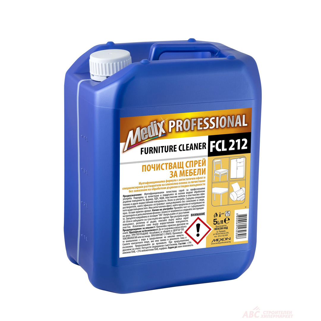 Медикс FCL 212 е мултифункционален почистващ спрей за професионална употреба. Формула с антистатичен ефект и специализирани разтворители на алкохолна основа за почистване без замазване на обработени дървени и гладки повърхности. Подходящ за почистване и поддръжка на всички видове обработени дървени повърхности, фурнир, ПДЧ, МДФ, пластмасови мебели и пластмасова офис техника и други водоустойчиви повърхности. Лесен за употреба. Има антистатичен ефект, който предпазва от натрупване на прах. Опаковка 5 литра.