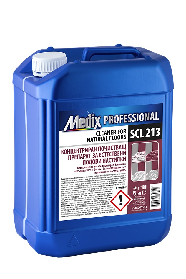 Медикс SCL 213 е концентриран почистващ препарат за естествени подови настилки. Защитава повърхностите и фугите. Без необходимост от изплакване и подсушаване. Високопенлив течен алкален препарат за професионална употреба. Специално разработен за естествени подови настилки като мрамор, гранит, камък, теракота с и без гланц, както и обработени дървени настилки като паркет, дюшеме и др. Грижи се за всички подови повърхности, като ги защитава от влага чрез образуване на предпазен филм. Със свеж дълготраен аромат. Опаковка 5 литра.