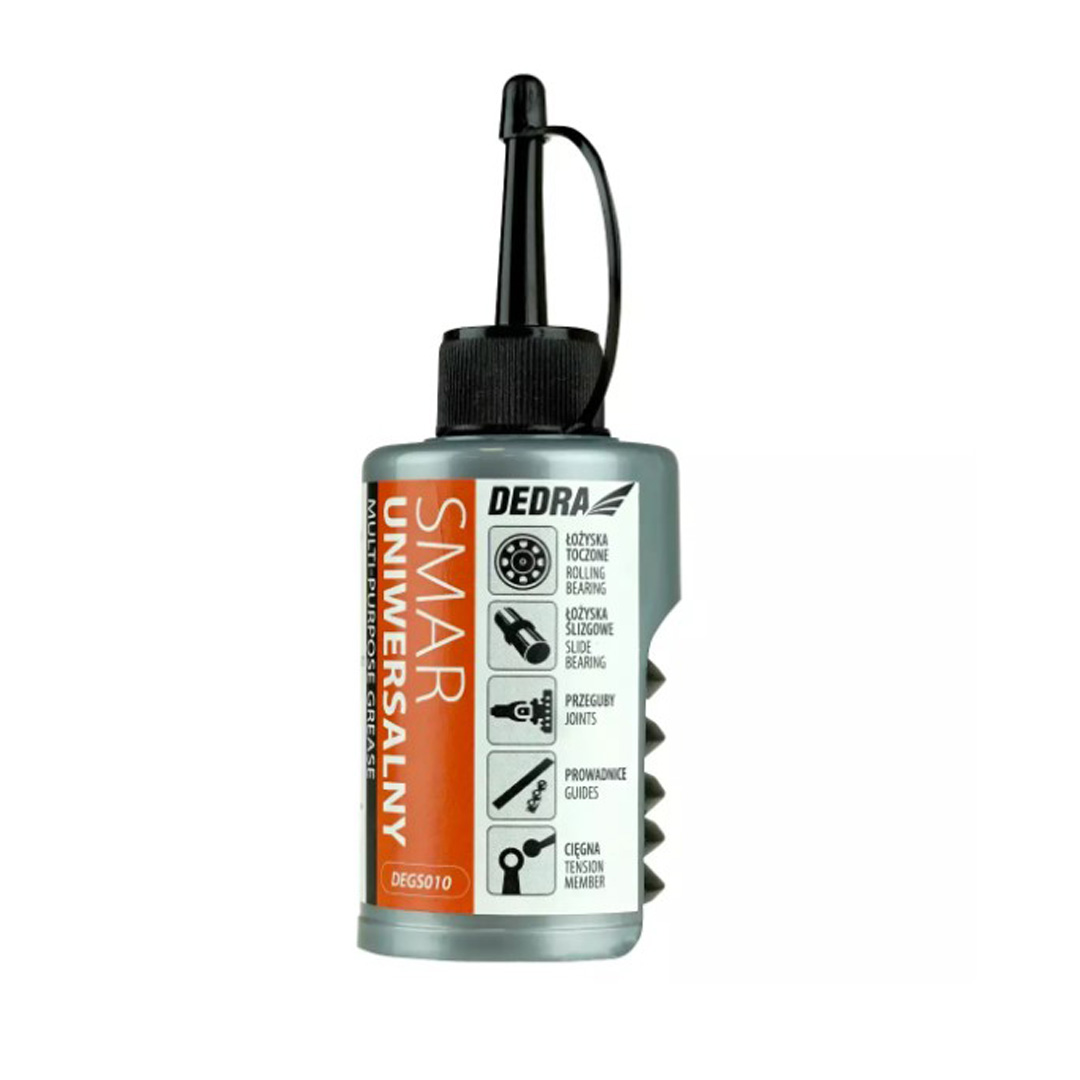 Универсалната грес DEGS010 е грес, предназначена за използване в търкалящи и плъзгащи лагери, шарнири, връзки и други възли, в които възниква триене. Благодарение на своя състав тя може да се използва в температурен диапазон от -25 градуса по Целзий до +125 градуса по Целзий. Характеризира се с устойчивост на високи натоварвания и е устойчив на измиване със студена вода. Това спомага за предпазване на работните части от корозия. Смазката се продава в удобен мехур, а удълженият тесен апликатор позволява прецизно нанасяне на смазката.