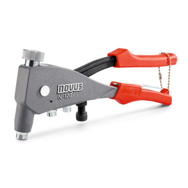 С ръчната стандартна нитачка Novus N-120 се занитват нит-гайки с вътрешна резба M4, M5, M6. Тялото на инструмента е изработено от алуминий, а подвижното рамо – от стомана. Към нитачката са прикрепени три сменяеми накрайника и гаечен ключ. Ергономичната дръжка може да се заключва. Има настройващ винт за ограничаване на хода.