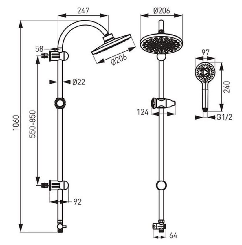 душ-система с пита за тропически дъжд и ръчен душ • метално окачване с плъзгач – 1060 мм • регулируемо разстояние между скобите – възможност за монтаж във вече съществуващи дупки в стената • диаметър на душ-пита – 200 мм • диаметър на ръчен душ – 100 мм • функции на ръчен душ – 3 • Easy Clean System – система за лесно почистване на варовик по ръчния душ и душ-питата • шлаух за душ в метална оплетка – 1500 мм • 700 мм шлаух с 1/2“ гайка – универсална връзка за всеки смесител за вана и душ • мета