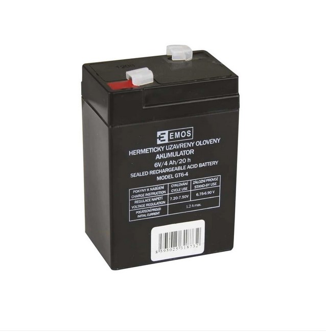 Капсулована оловно-киселинна батерия на „Emos“ с широко приложение, създадена за работа при особено високи натоварвания. Батериите от този тип не изискват допълнителна поддръжка, характеризират се с компактни размери, висока ефективност и дълъг експлоатационен живот. Стандартният живот на батериите е 5 години. Основни приложения при: системи за аварийно осветление акумулаторни фенери детски акумулаторни колички Батерията е съвместима със следните модели акумулаторни фенери: JML 2999 JML 2936 2931NS 2867 CE 100 RC 3810.