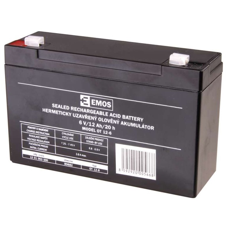 Оловно акумулаторна батерия с напрежение 6V и капацитет 12Ah. Тегло 1.8 кг. Клема: faston 4.7 мм Размери: 151 × 51 × 94 мм. Опаковка 1 бр.