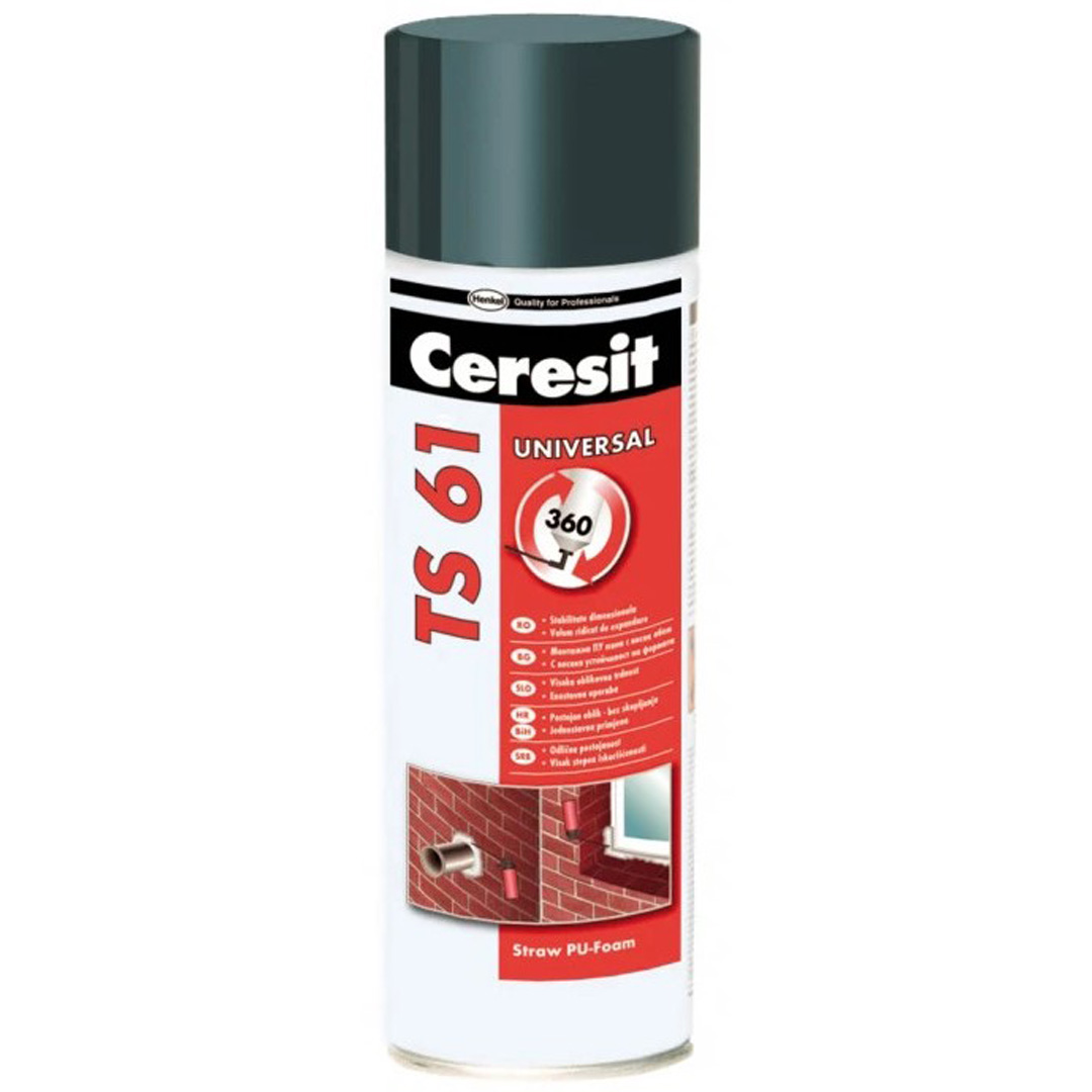 CERESIT TS 61 е еднокомпонентна, втвърдяваща се под въздействието на влажността полутвърда полиуретанова пяна, с отлична клетъчна структура и добра механична якост. Тя се използва и нанася лесно с доставената сламка. Пяната се разширява сама и докато се втвърди, се разширява близо два пъти – затова трябва да се съобрази известно свободно пространство за разширяване. Отлично залепва за дърво, бетон, камък, метал и др. Количеството втвърдена пяна зависи до голяма степен от условията на работа – температура, влажност на въздуха, пространство за разширяване и др. Продуктът не съдържа хлорирани и флуорирани въглеводороди (CFC) под налягане. Опаковка: флакон от 300 мл.