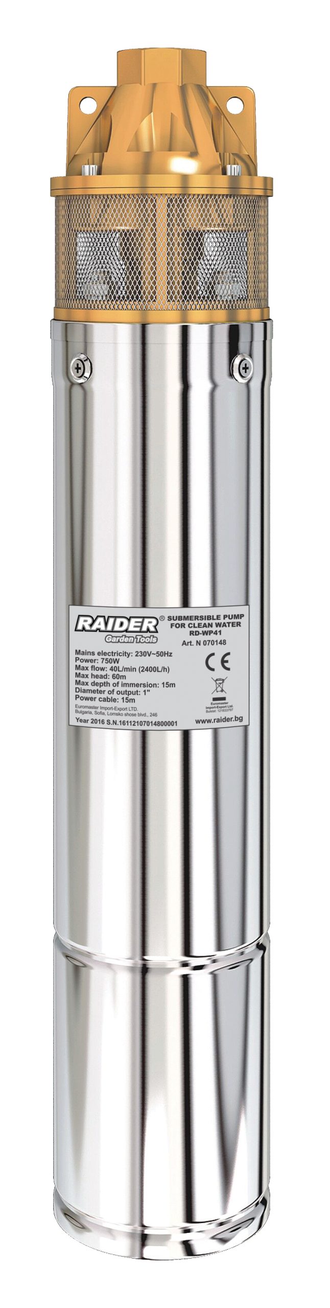 Дълбочинната водна помпа Rider RD-WP41 е предназначена за изпомпване на чиста вода от сондажни отвори, кладенци и резервоари. Управлението на помпата става посредством външно елетрическо табло с вграден волтметър и елетронна система, която предпазва елетродвигателя от прегряване.