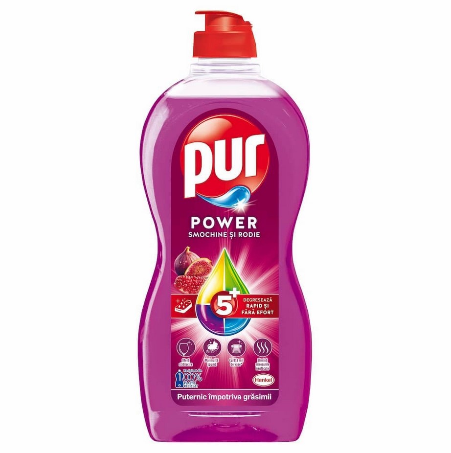 Препарат за миене на съдове Pur Power Нар 450мл със самообезмасляващо действие, отстранява мазнината и упоритите замърсявания бързо и лесно, осигурява блясък и повече пяна, ефективен срещу неприятни миризми. Новата формула на Pur Power премахва мазнините по-бързо и по-лесно без нужда от интензивно търкане. Оставя приятен и свеж плодов аромат на нар и смокиня.