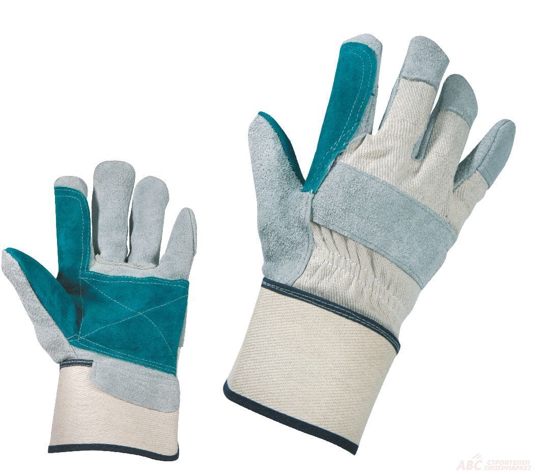 Ръкавици изработени от телешка цепена кожа, подсилени с двоен пласт в областта на дланта, с подплата, бял памучен плат на гърба и подсилен маншет.Отговарят на европейските стандарти EN 420 и EN 388.