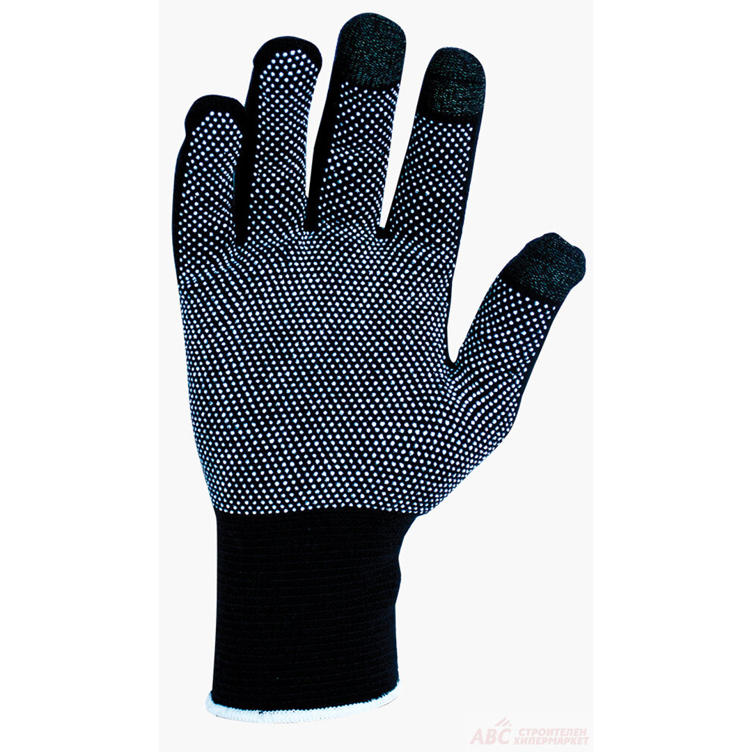Ръкавици изработени от памук и ликра с покритие от малки бели PVC точки. Подплата 13 gauge черен памук и ликра. Пръсти с електрокондуктивни нишки. Позволяват работа с touch screen екрани.