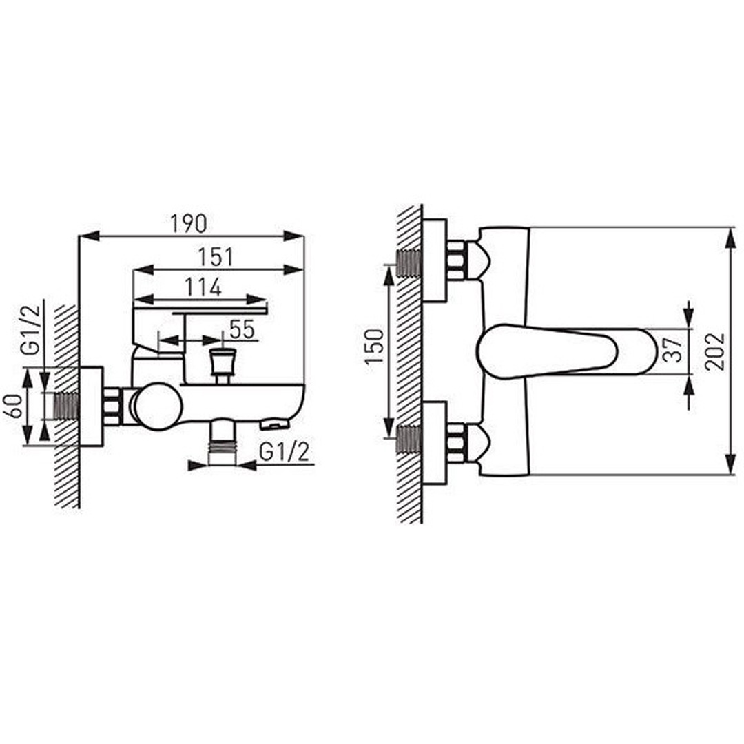 смесител стенен за вана/душ • без аксесоари • керамична глава • автоматичен превключвател за вана/душ • аератор M24x1 • гъвкава връзка G1/2, разстояние между центровете 150 ± 20 мм • хром