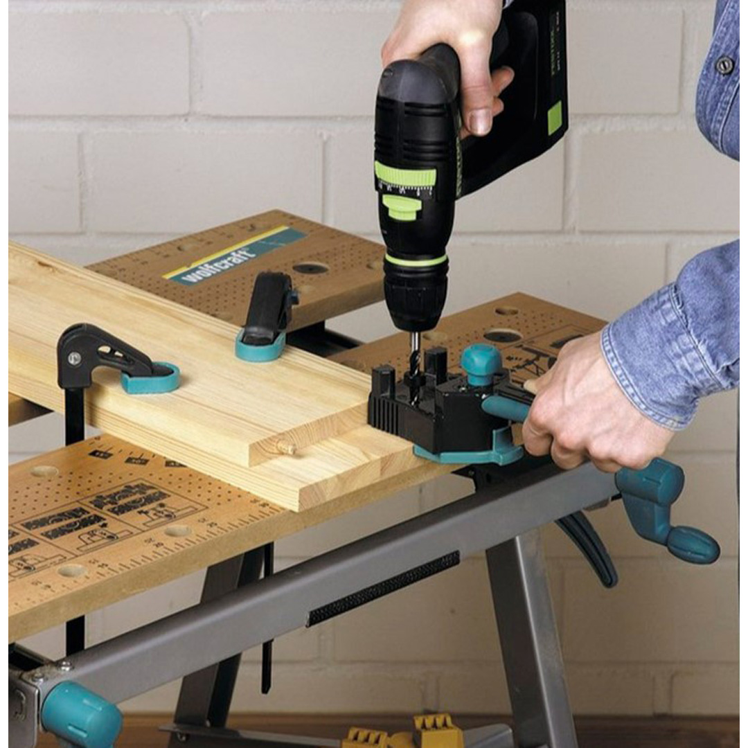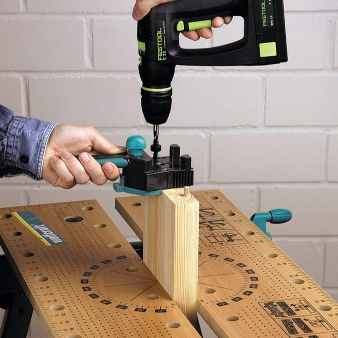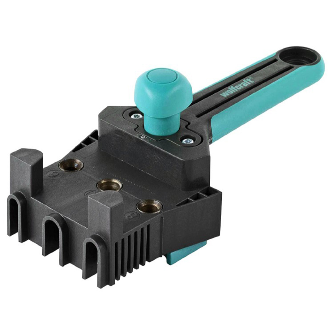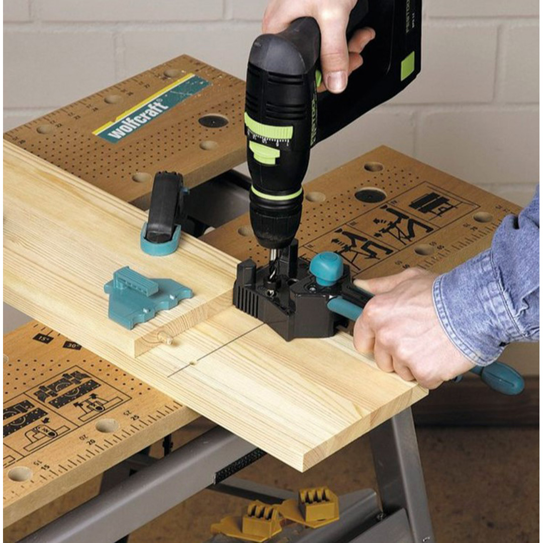 Универсален шаблон за пробиване на отвори за дибли за изработване на стабилни ъглови, Т-образни и плоски сглобки. Отворите са за дибли с диаметър 6, 8 и 10 мм, а с шаблонът може да се работи с дъски с дебелина от 12 до 30 мм.