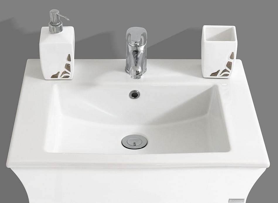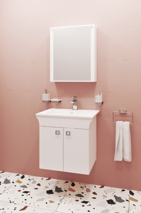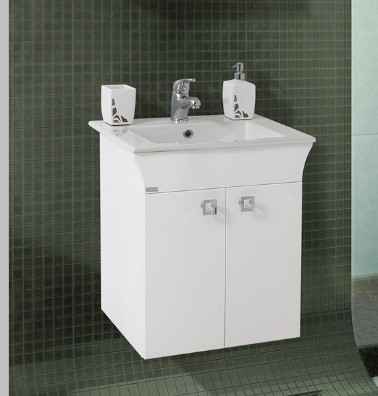 Долният шкаф е окачен, с размери ш.55 д.43 в.57,5см, с две врати. Порцеланова мивка. В цената не е включен смесител.