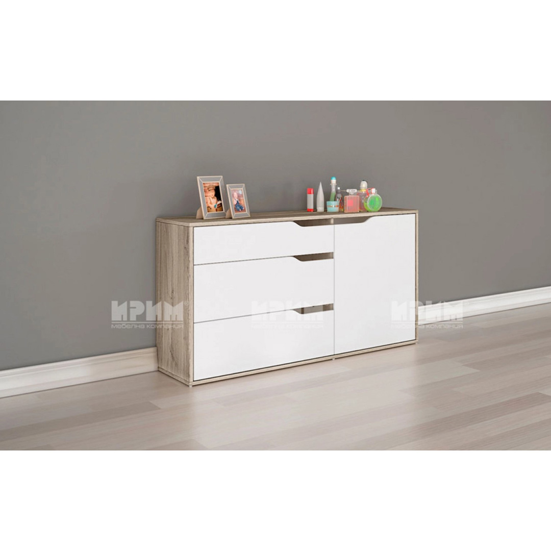 Скрин Сити 3042 е скрин в комбинация от дървесен корпус и бяло лице. Скринът разполага с 3 чекмеджета, от които най-горното е по-малко и една вратичка.