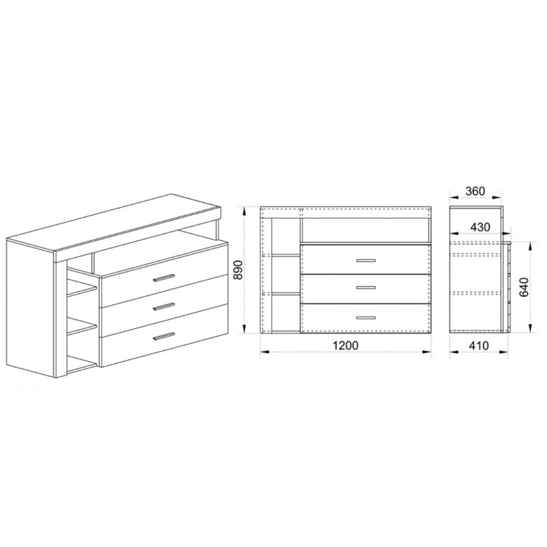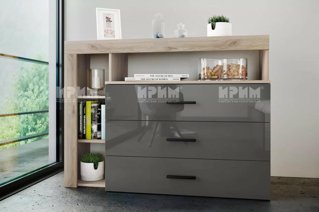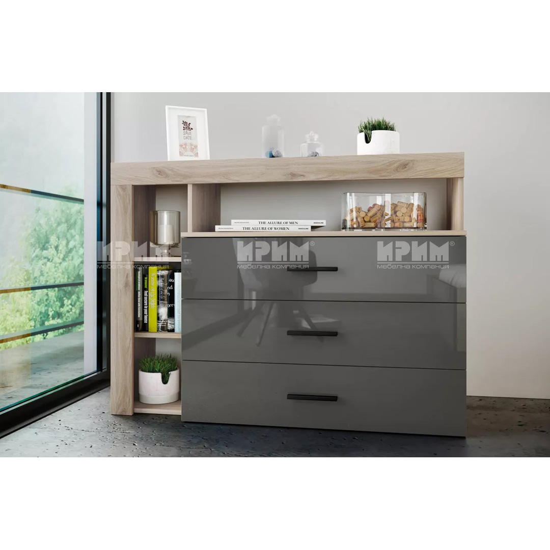 Скрин Сity 3047 с три чекмеджета и допълнителна етажерка към него, изключително модерен и стилен. Гланцовият МДФ му придава много луксозна и изтънчена визия. Към скрина има и отворени етажерки.
