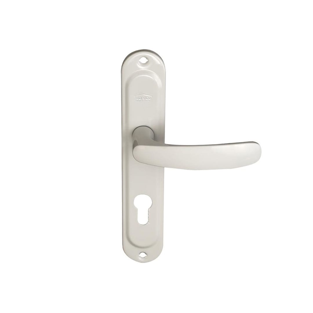 Обикновена дръжка СОНИКО СИЛИСТРА 90 мм, бяла. За дървени и интериорни врати. Габаритните размери на шилда позволяват да се покрият стари отвори от ремонти. Комплектът включва 2 дръжки и крепеж. Произход: България. 24 месеца гаранция.
