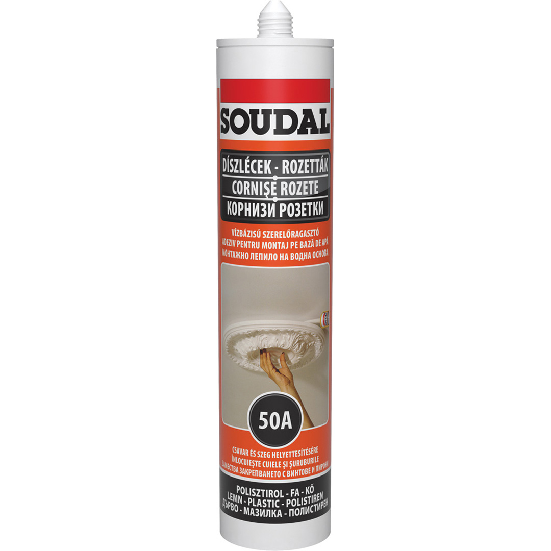 SOUDAL 50А е водоустойчиво монтажно лепило на основата на акрилна дисперсия – без мирис и безвредна за чувствителните декоративни елементи. Не съдържа разтворители и не отделя никакви летливи съединения. Отлично залепване към всички порьозни повърхности : бетон, тухли, гипсокартон, дърво и др. Използва се за фиксиране на розетки, профили и декоративни елементи направени от полистирен и други материали, корк и др. С приложение при монтаж на первази, прагове, пана от дървесина и материали на дървена основа. Спешно залепване на керамични плочки, ел.ключове, пластмасови дръжки.