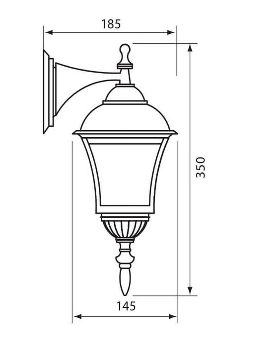Фенер, цвят червена патина, алуминиев корпус, матирано, декоративно стъкло, за монтаж върху стена с горен носач, фасунга за лампа Е27, IP44. Максималното натоварване е 1 х 60W за лампи с нажежаема жичка.