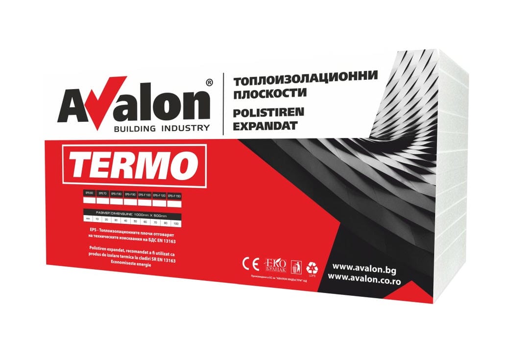 EPS – експандиран полистирен Avalon TERMO, е безвреден за околната среда и здравето на човека топлоизолационен материал с широко приложение в термоизолацията на фасади, стени, покриви, подове и други. Отличава се с отлични топлотехнически характеристики, много добър коефициент на дифузионно съпротивление, осигуряващ „дишане“ на изолираните конструкции и много добри шумоизолационни свойства.