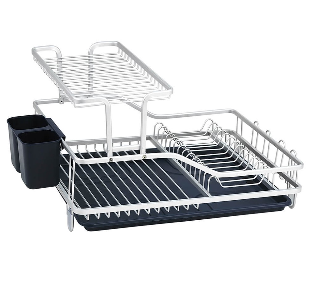Сушилник за съдове Luigi Ferrero 2 нива Висококачествена рамка от анодизиран алуминий, устойчива на ръжда Сваляема поставка за прибори с дълги дръжки – с две отделения Удобна табла за отцеждане Нехлъзгащите се крачета правят сушилника стабилен върху кухненски плотове Стойки за чаши за чай и кафе Размер без приставки: 46×35.2×27.3cm