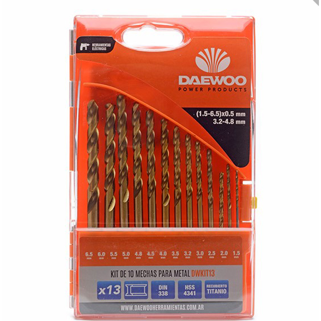 Комплект свредла за метал DAEWOO DWKIT13 се състои от 13 броя свредла с размери 1.5, 2, 2.5, 3, 3.2, 3.5, 4, 4.5, 4.8, 5, 5.5, 6, 6.5 мм. Титаниевото покритие удължава експлоатационния живот на свредлата.