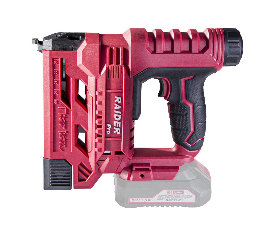 Акумулаторен комбиниран такер Raider RDP-SST20 20 V, Li-ion, 030153 за скоби Tип 55 6×1.08 мм – 15-25 мм и пирони TYPE 47 15-32 мм.