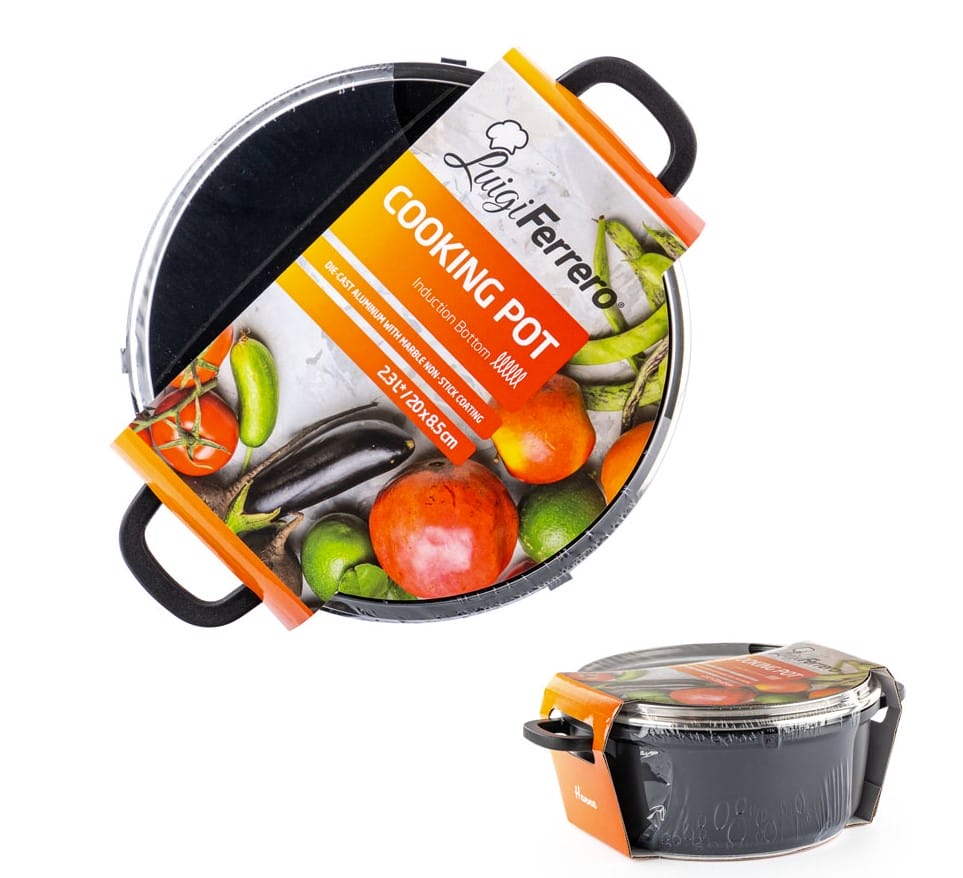 Лят алуминий за максимална топлопроводимост Дебелина на стената -2.5мм Дебелина на ръб и дъно – 5.5мм Устойчиво незалепващо покритие с мраморен ефект Подходяща за електрически, газови, стъклокерамични, халогенни и индукционни котлони Подходяща за съдомиялна машина