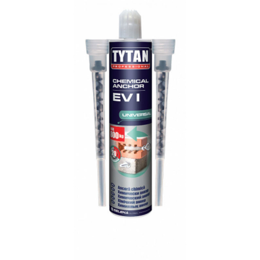 TYTAN PROFESSIONAL EV I химически анкер се използва за монтаж на всякакъв тип съединения и конструкции към основи. Отлично решение при необхоимост от монтаж в близост до ръба на основата. С добра адхезия към повечето строителни продукти, като тухла, камъни, кухи конструкции, бетон. Най-често се използва при монтажа на парапети, тенти и други тежки и отговорни конструкции. Опаковка от 300 мл. флакон.