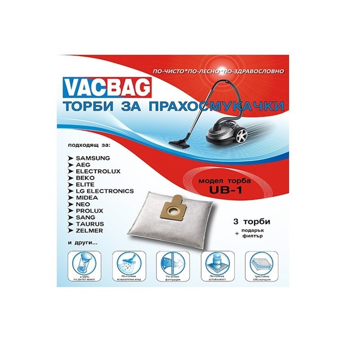 Торбички за прахосмукачка от трислоен, нетъкан текстил с висока въздухопропускливост и здравина. Качествата на материала позволяват по-пълно оползотворяване на обема й, като същевременно се използва пълната мощност на прахосмукачката.