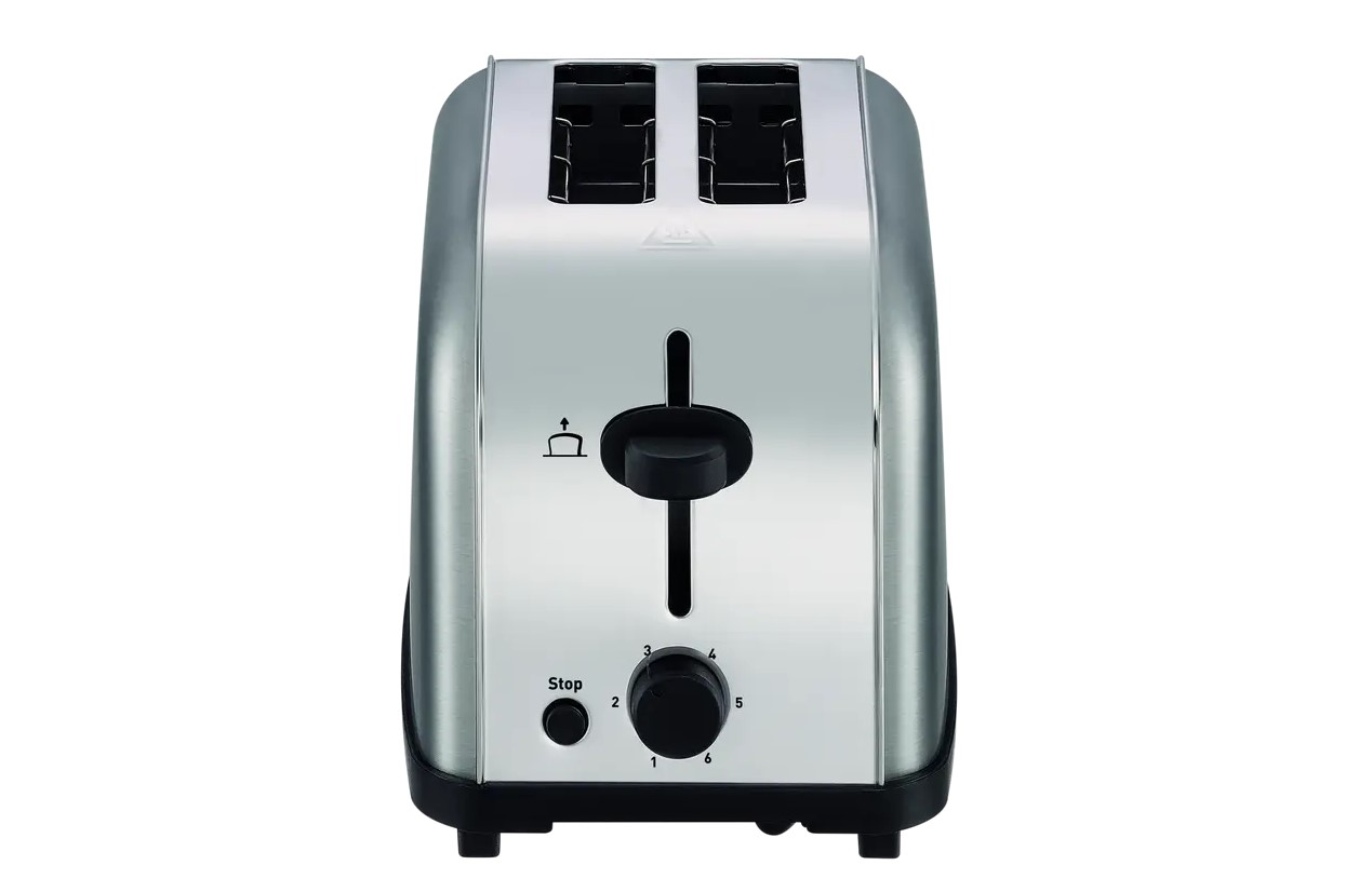 Много компактен тостер с две отделения, за да спестите място на кухненския плот, с облик изцяло от неръждаема стомана