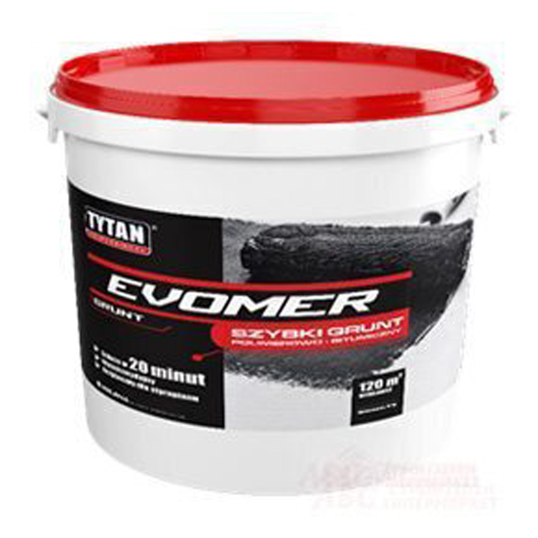 TYTAN EVOMER е бързосъхнеща битумно-полимерна емулсия за грундиране на повърхности преди полагане на течни битумни хидроизолации и рулонни мушами. Благодарение на своята полимерна формула грундът се отличава с перфектна адхезия към всички строителни основи. Прилага се за грундиране на минерални основи (бетон, цимент, керамика, гипс, OSB плоскости, битумни и метални повърхности). Подготовка на основата за полагане на самозалепващи мушами и такива с газопламъчно залепване, течни хидроизолационни покрития.