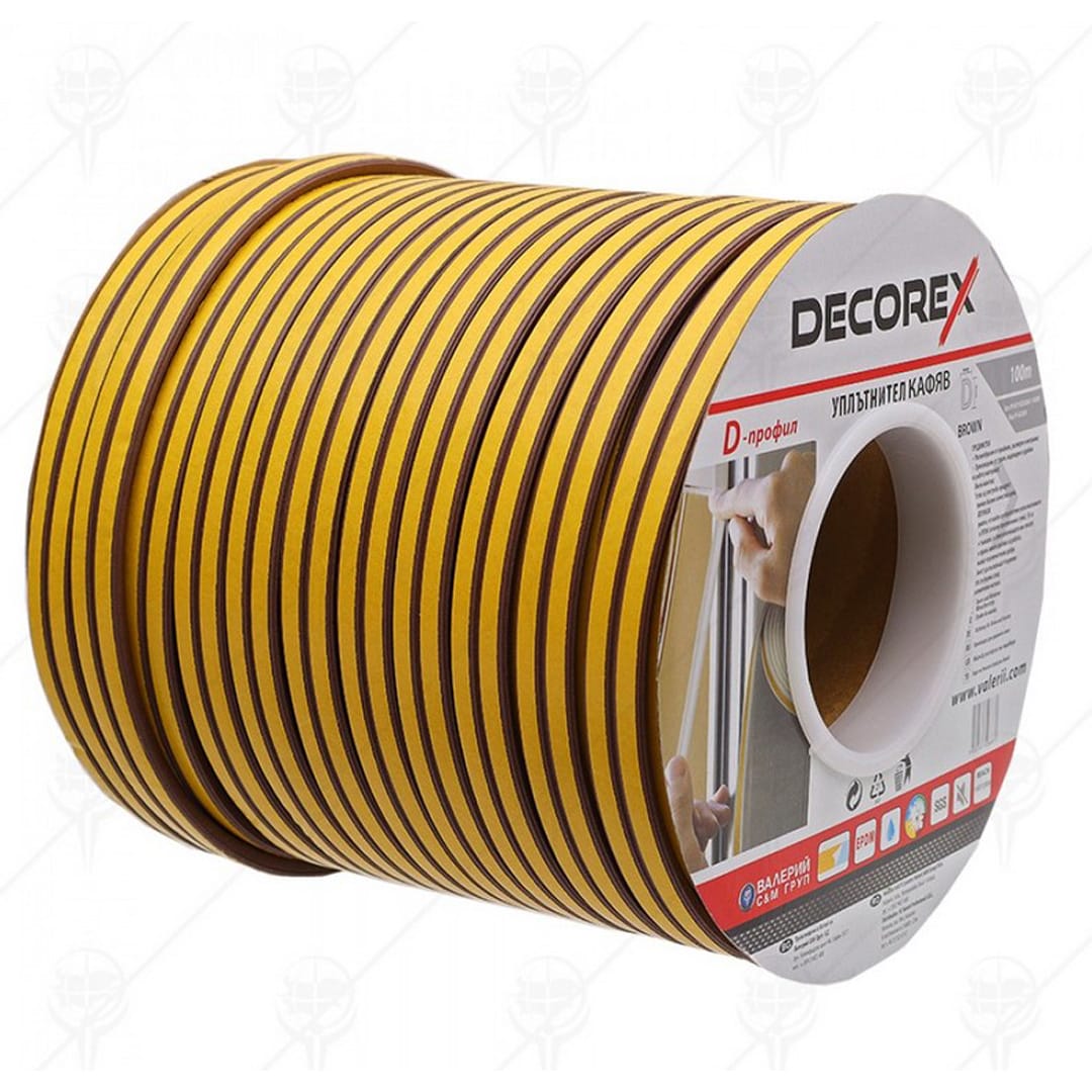Уплътнител за врати и прозорци DECOREX е бял на цвят, профил D. Уплътнителят е с дебелина 5 мм и дължина 100 м. Произведен е от траен, надежден и удобен за работа материал. Лесен за монтаж. Изработен от EPDM (етилен-пропиленова гума). Характерно за този вид гума е, че възвръща първоначалната си форма след продължителен натиск.
