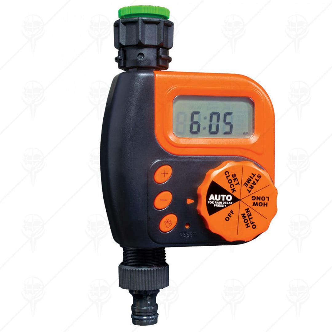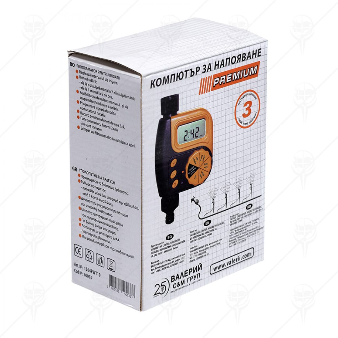 Таймер-програматор за поливане PREMIUM е предназначен за кран с резба 3/4″. Необходимото налягане при работа е 1.8 бара. Ритъмът на поливане е от всеки ден до веднъж седмично – от 1 минута до 5 часа. С възможност за ръчно поливане и отлагане на поливането. Програмирането става лесно чрез въртящият се превключвател. Има метален филтър на входа за вода. Доставя се без батерия.