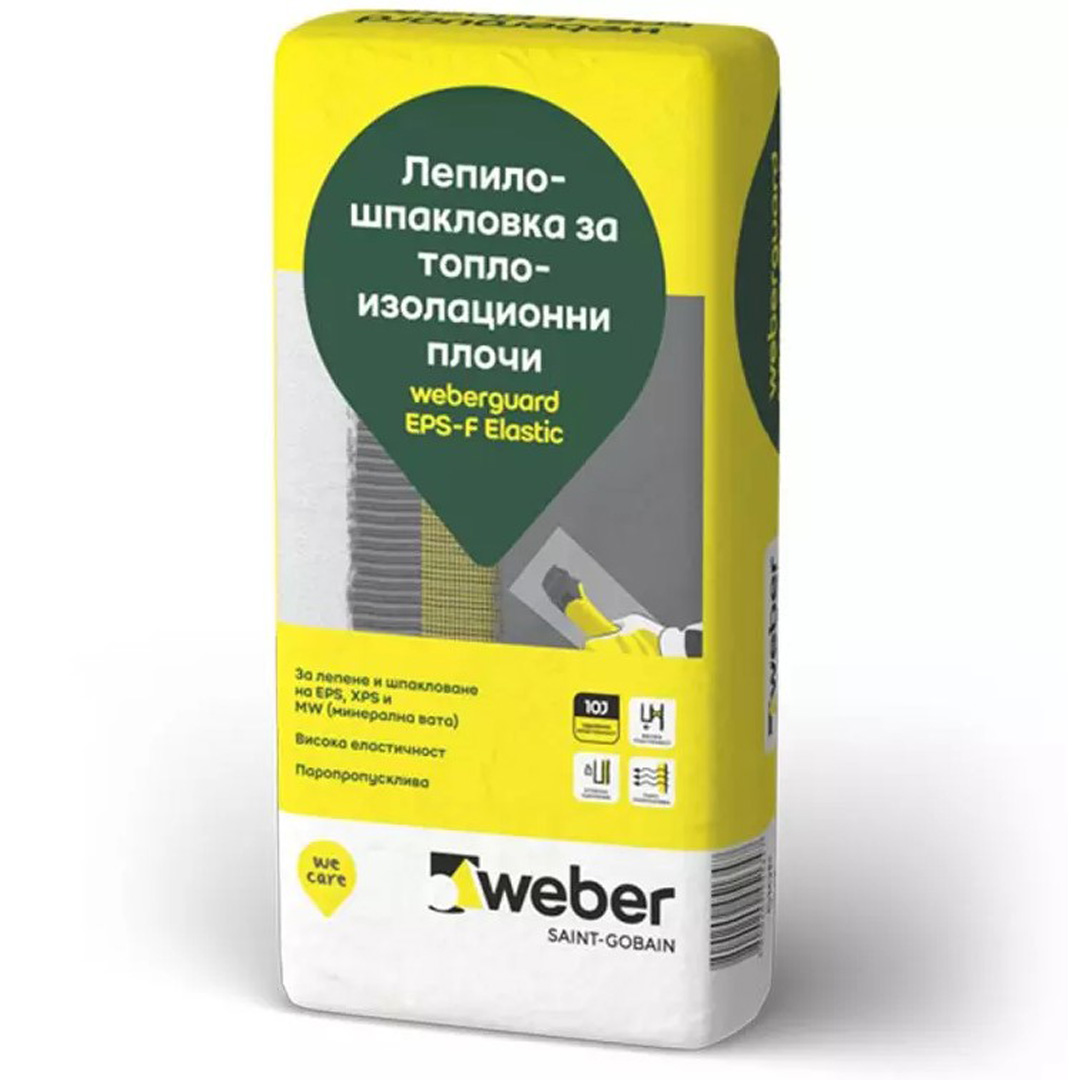 weberguard EPS-F Elastic (510P) с подобрена формула се използва за за лепене на топлоизолационни плочи EPS-F, EPS-G, XPS и минерална вата (MW). weberguard EPS-F Elastic e суха прахообразна лепилнo-шпакловъчна смес на база на цимент и полимерни добавки за лепене и шпакловане на фасадни топлоизолационни плочи. Отличава се с висока здравина и еластичност, висока пластичност, отлично сцепление с основата и много добра паропропускливост. Лепило-шпакловката weberguard EPS-F Elastic е част от топлоизолационните системи webertherm Family Classic и webertherm Family Optimum. Освен за употреба при топлоизолиране на фасади е подходяща и за самостоятелно шпакловане.