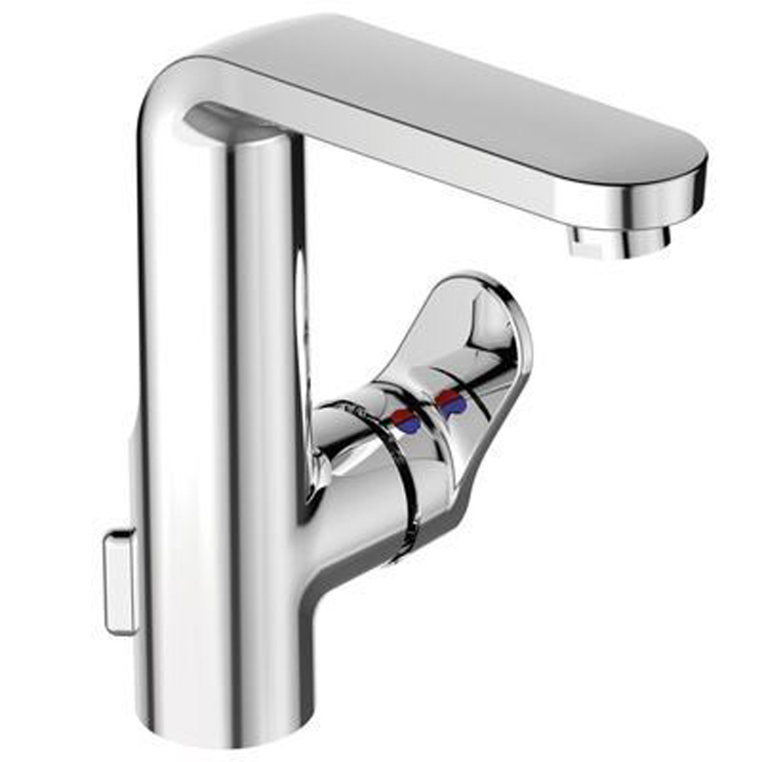 Стоящ смесител за умивалник с висок чучур, марка Видима. 38 mm керамичен затварящ механизъм FirmaFlow® с вграден ограничител на топлата вода. Присъединяване EASY-FIX с гъвкави връзки G3/8“. Аератор Perlator 5 l/min.
