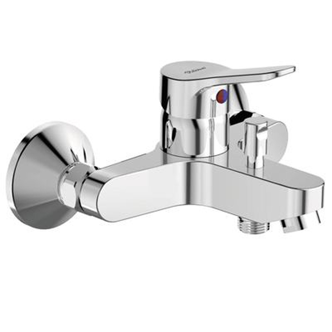 Стенен смесител за душ/вана, марка Видима. 35 mm керамичен затварящ механизъм с ограничител на топла вода. Месингово лято тяло. Възвратен клапан. Стандартно присъединяванес S-холендри. Perlator аератор. Автоматичен разпределител.