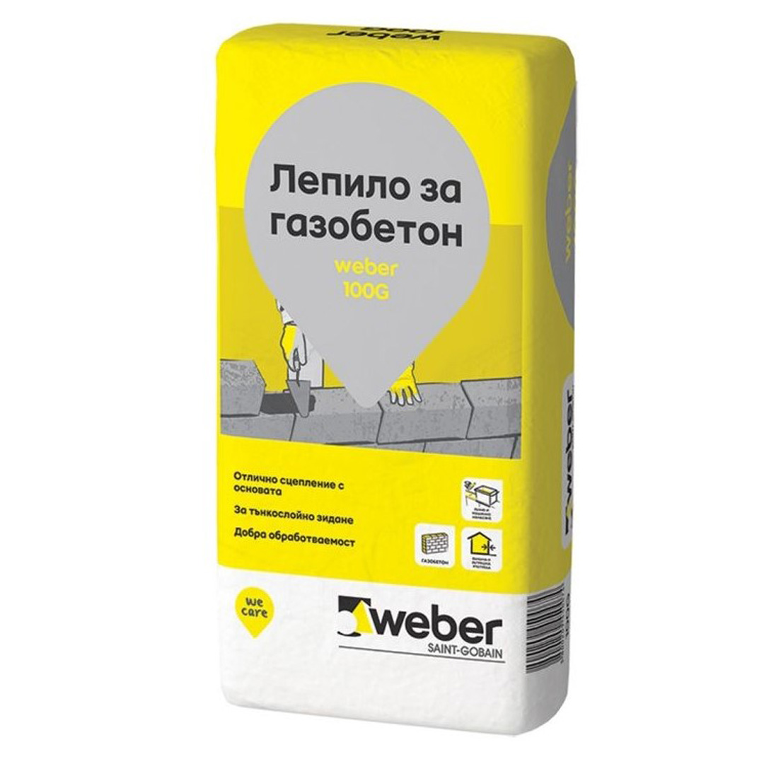 weber 100G е суха лепилна смес за зидане на всякакъв размер блокчета от газобетон при вътрешни и външни условия. Подходяща e за запълване на фугите на зидарията и за изравняване на повърхността. За изграждане на неармирана зидария с газобетонни блокове. Спазвайте стриктно съотношението вода–сух материал, указано на опаковката. Високите температури намаляват отвореното време за работа.