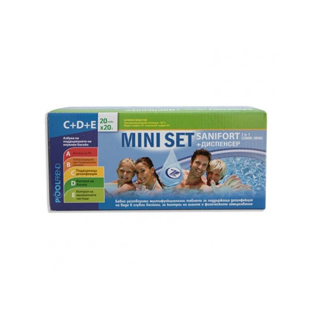 Комплект “Мини сет” съдържа една опаковка Санифорт комби таблети 20 г (мини) х 20 и плаващ диспенсер за него.